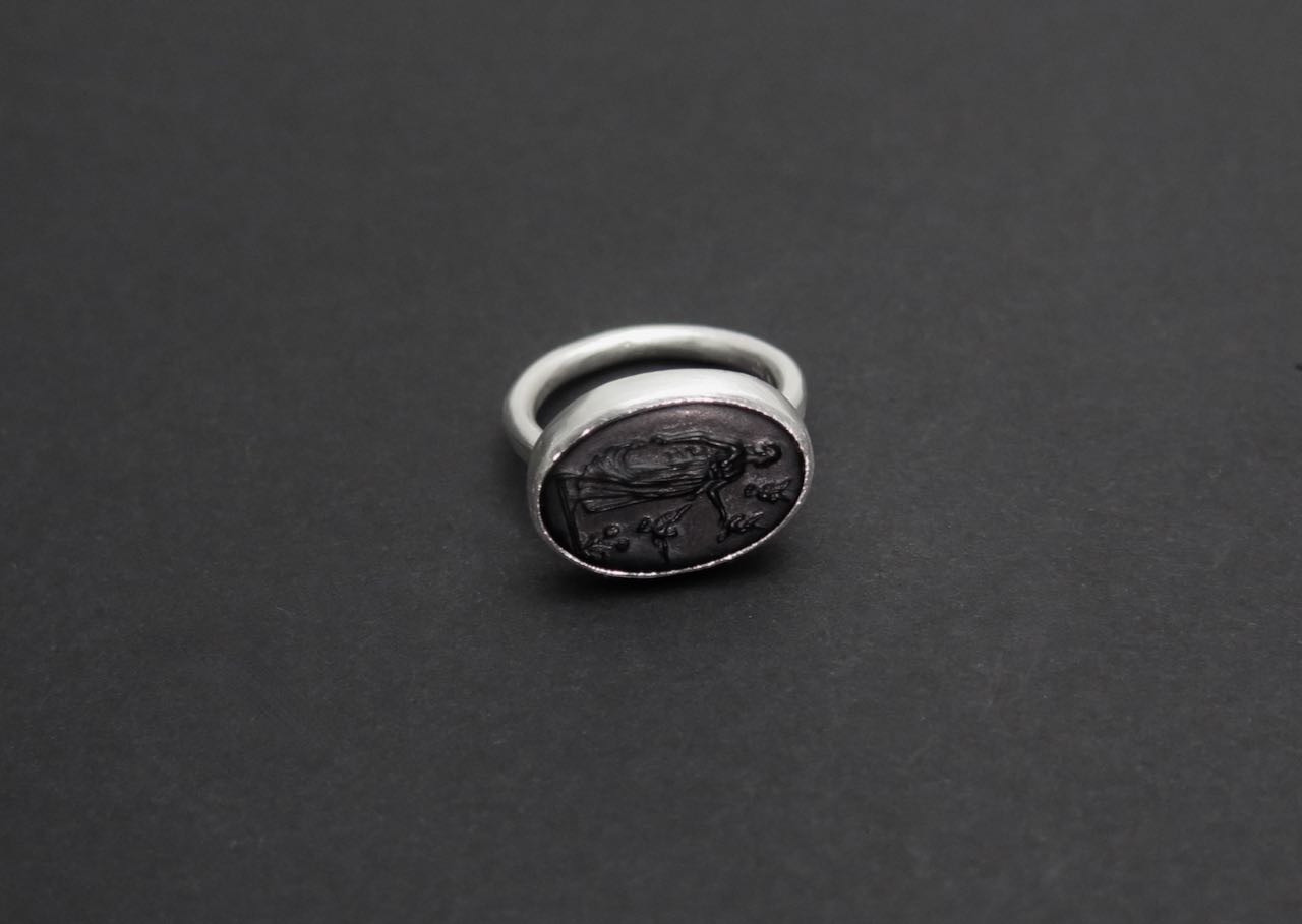 Aphrodite black glass cameo 12x15mm, sterling silver, 2.5mm round band, size N