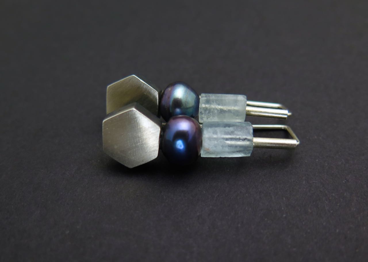 Aquamarine 10mm, black pearl 8mm, sterling silver, 30mm drop
