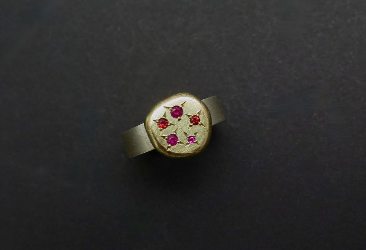 9k gold top 10mm, ruby, garnet, pink sapphires, 6mm wide band, size N