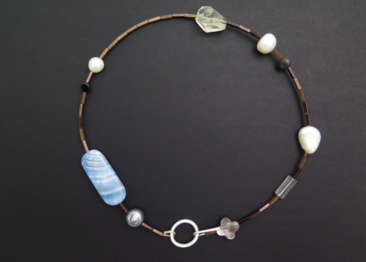 Pearl, pale blue calcite, onyx, quartz, mother of pearl, hematite, length 50cm
